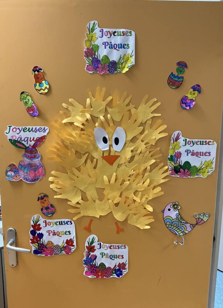 Découpage et coloriage appliqué afin d’aboutir à cette belle porte décorée aux couleurs de Pâques. 🐣 De très belles cocottes sont venues nicher…
