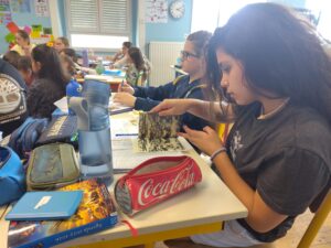 Camille Strappazzon a partagé aux élèves les différentes créations qu’elle a pu faire, chacun a pu observer avec plaisir et étonnement, parfois, les estampes (tirage de l’impression de la gravure) et les matrices (support qui est gravé et qui imprime) de l’artiste.