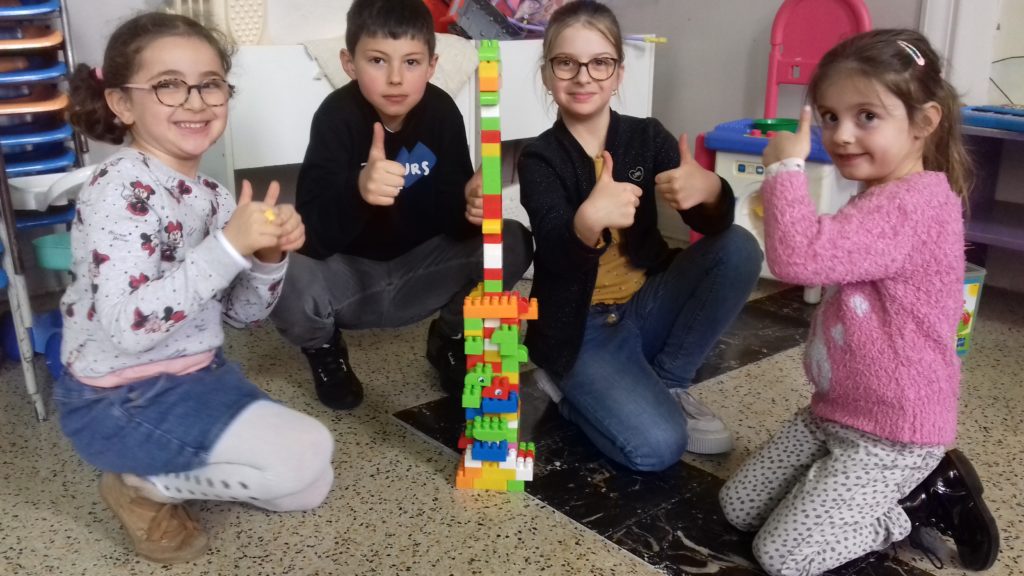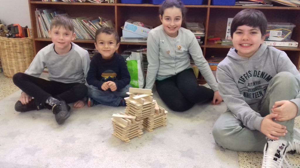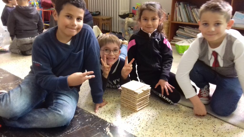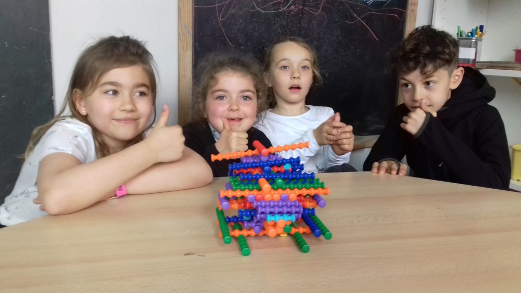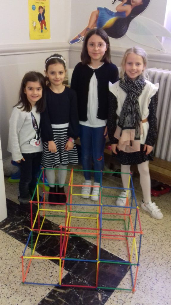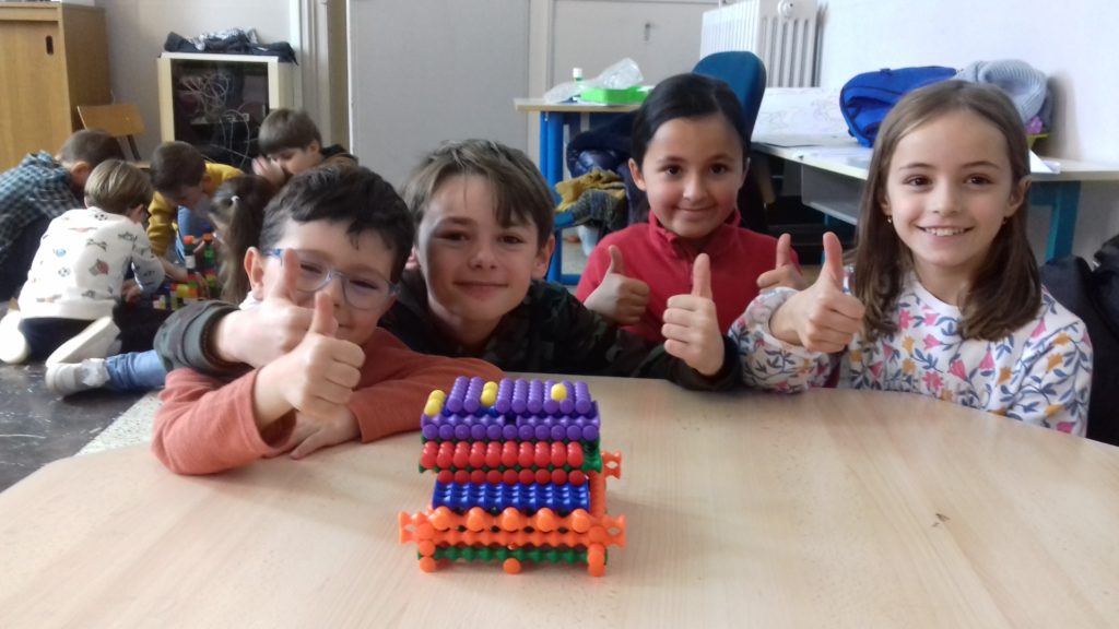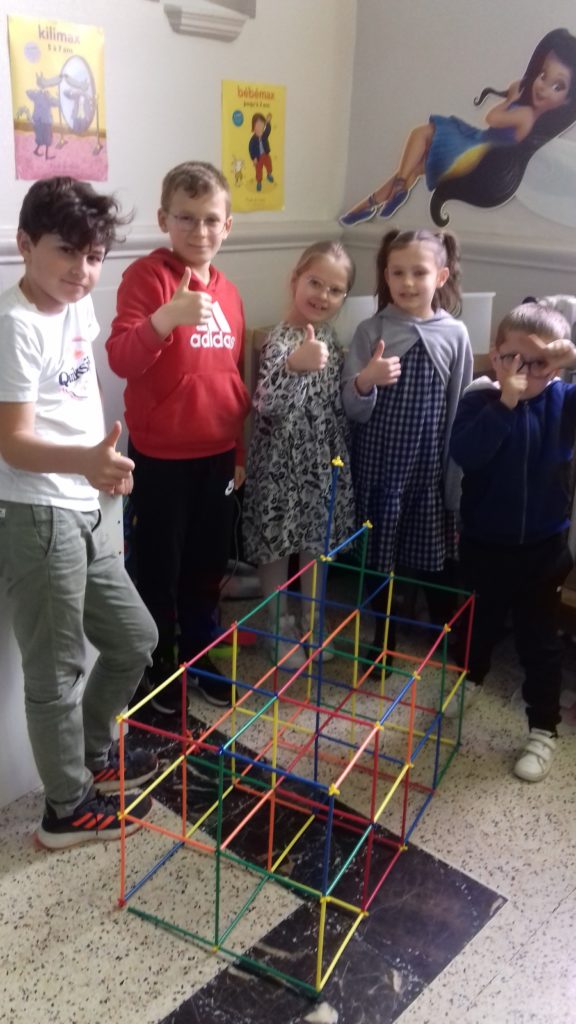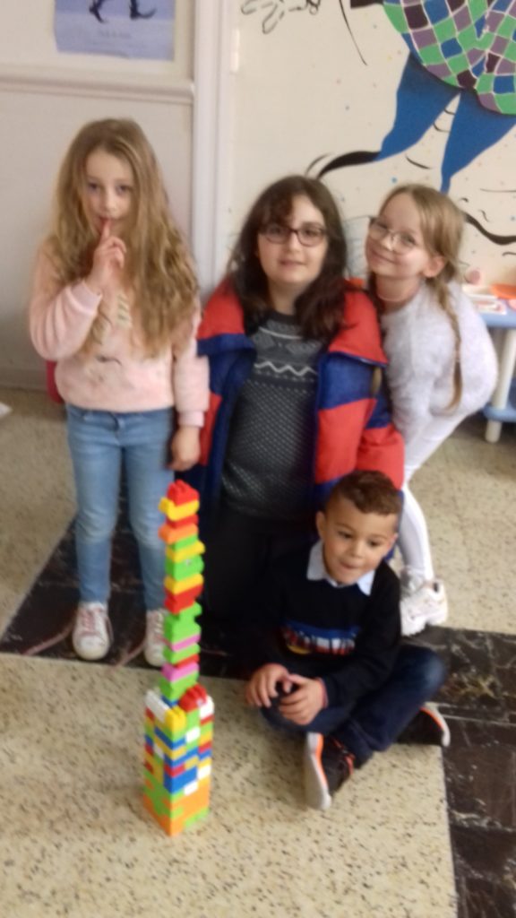 A cette occasion tous les élèves, de la moyenne section au cm2 étaient mélangés afin de constituer des groupes. Durant cette journée, tous ces groupes devaient relever des défis et l’un d’entre eux était : réaliser une construction avec 100 objets….100 kaplas, 100 pièces de mécanos, 100 pailles, 100 cubes, 100 duplos,…