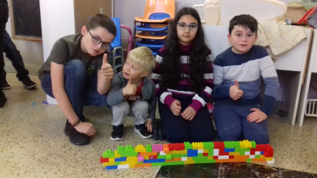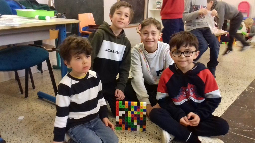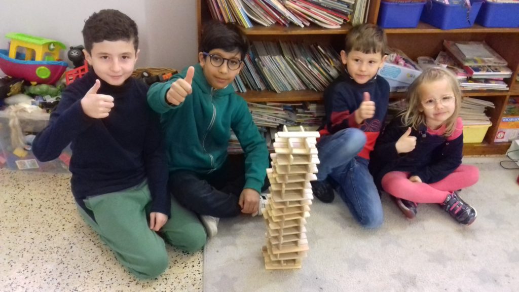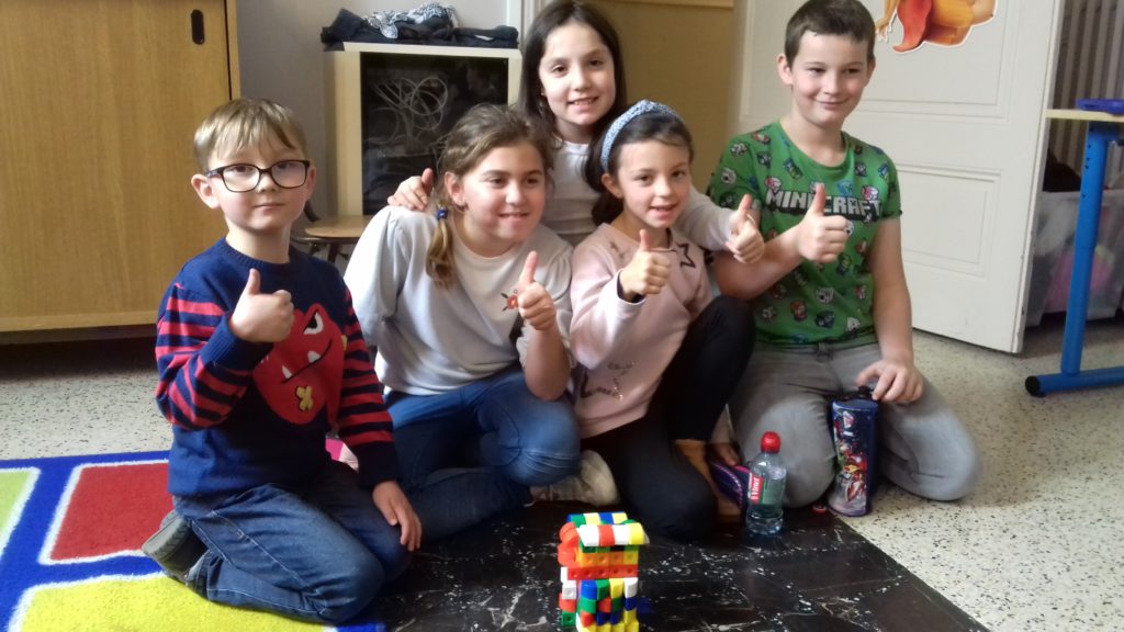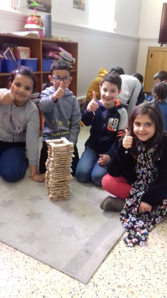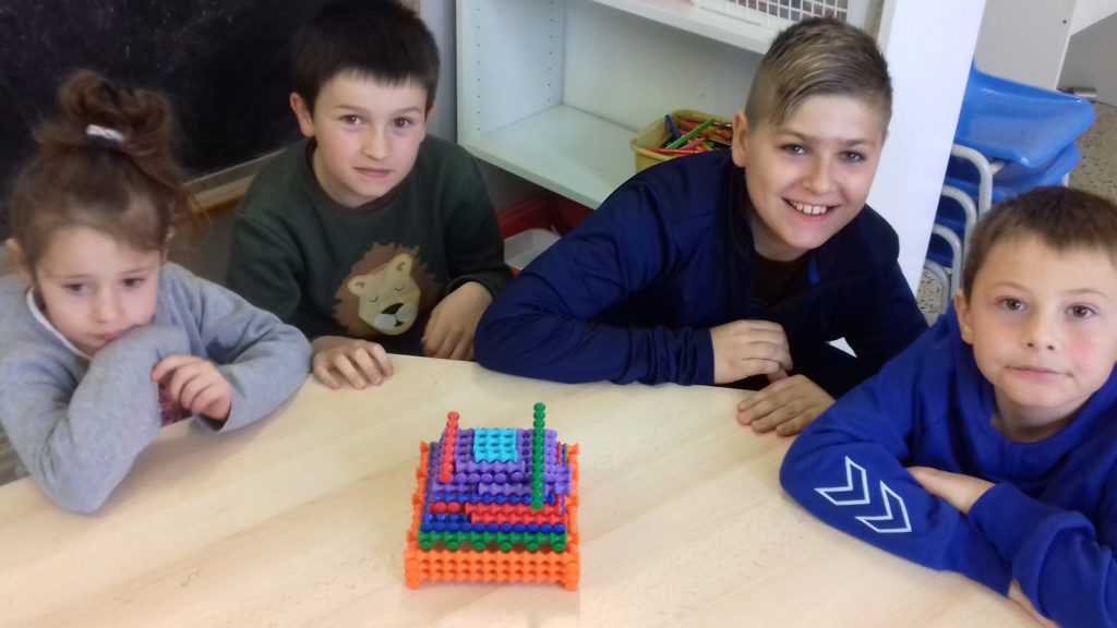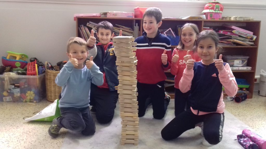 A cette occasion tous les élèves, de la moyenne section au cm2 étaient mélangés afin de constituer des groupes. Durant cette journée, tous ces groupes devaient relever des défis et l’un d’entre eux était : réaliser une construction avec 100 objets….100 kaplas, 100 pièces de mécanos, 100 pailles, 100 cubes, 100 duplos,…