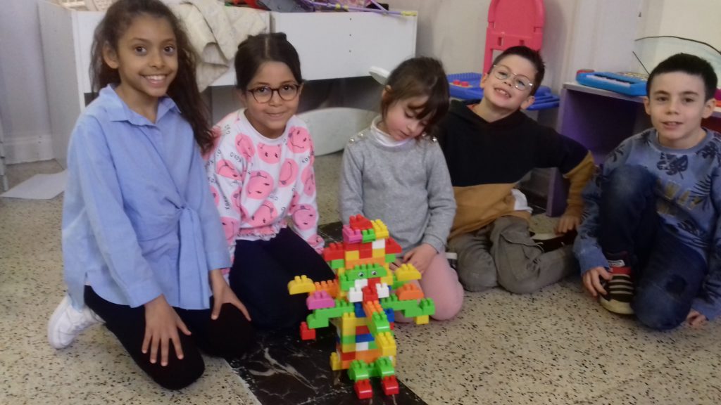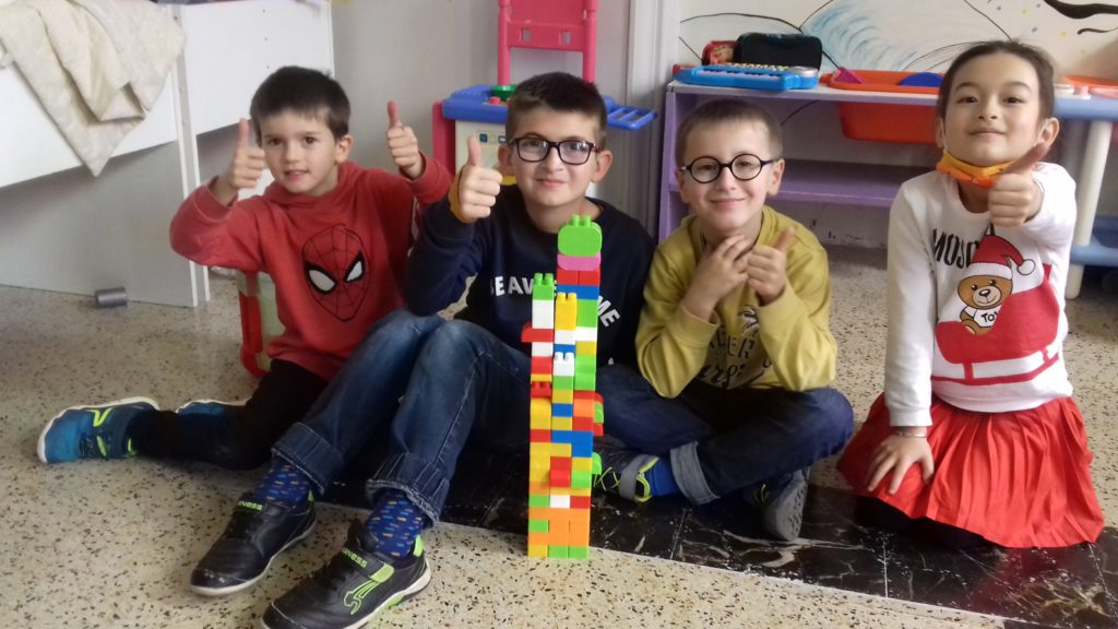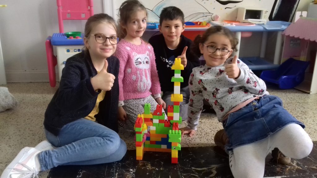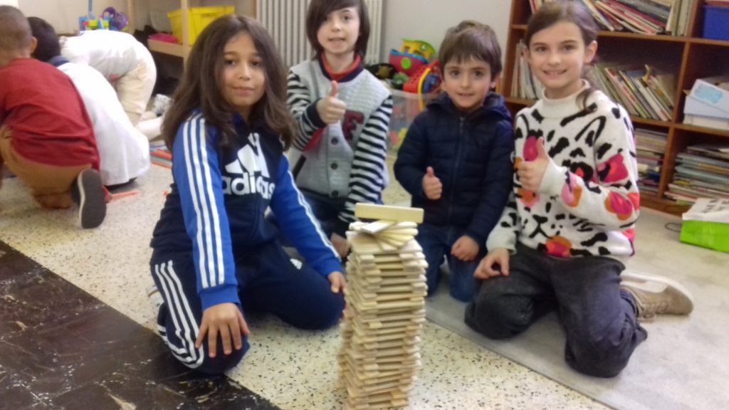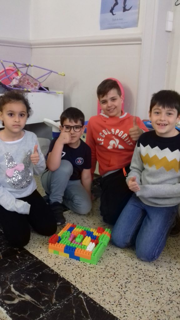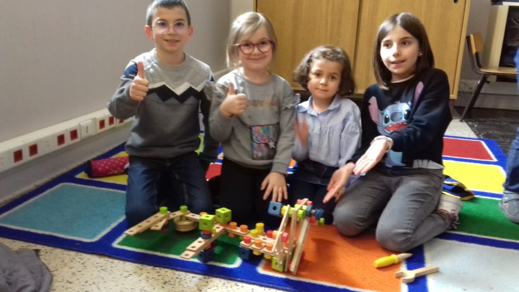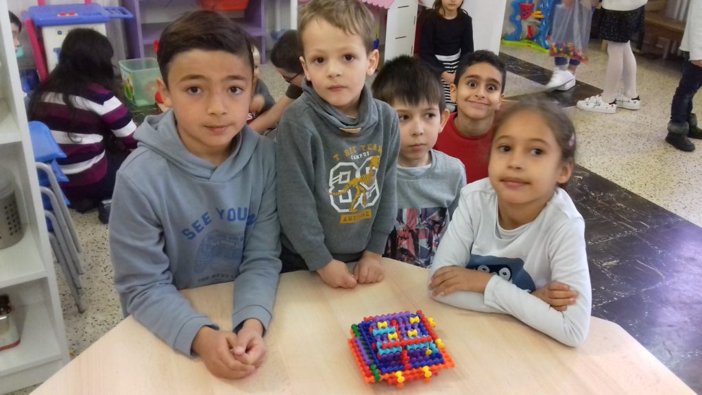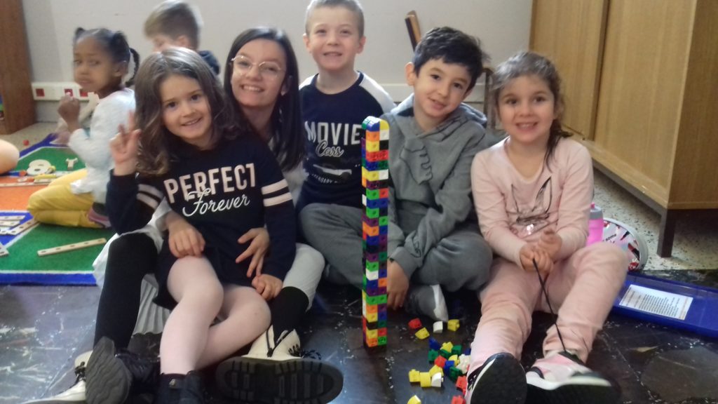 A cette occasion tous les élèves, de la moyenne section au cm2 étaient mélangés afin de constituer des groupes. Durant cette journée, tous ces groupes devaient relever des défis et l’un d’entre eux était : réaliser une construction avec 100 objets….100 kaplas, 100 pièces de mécanos, 100 pailles, 100 cubes, 100 duplos,…