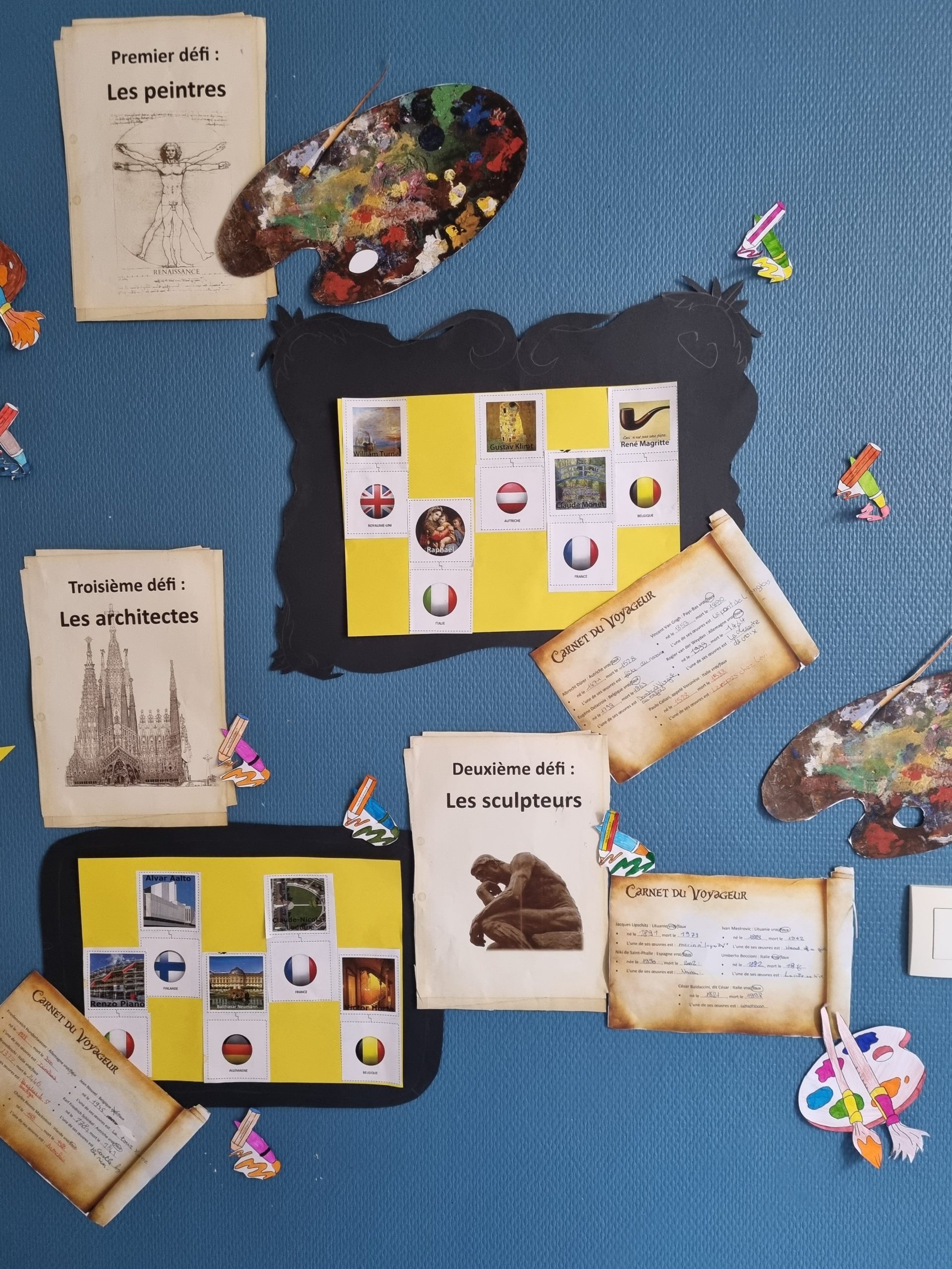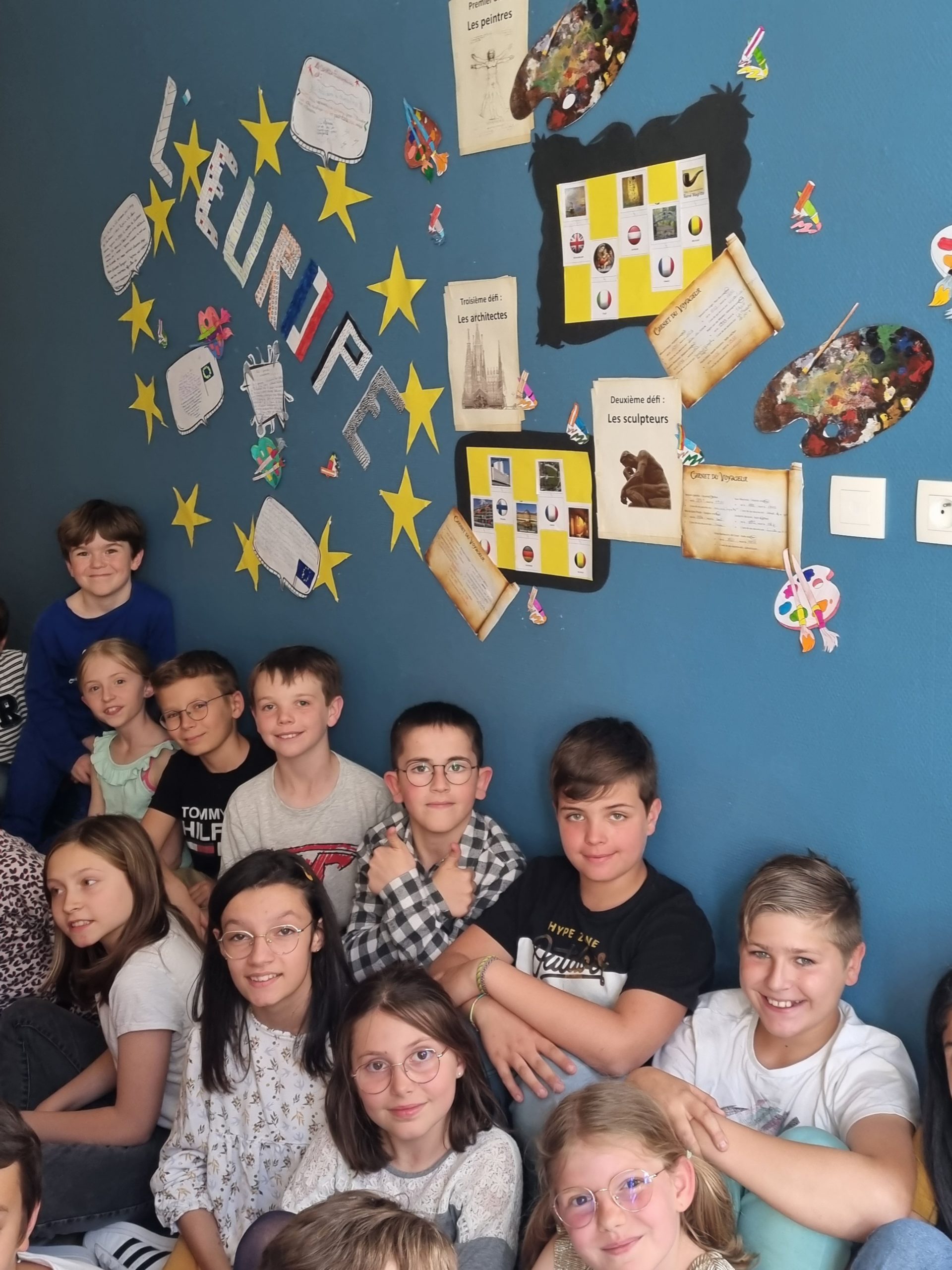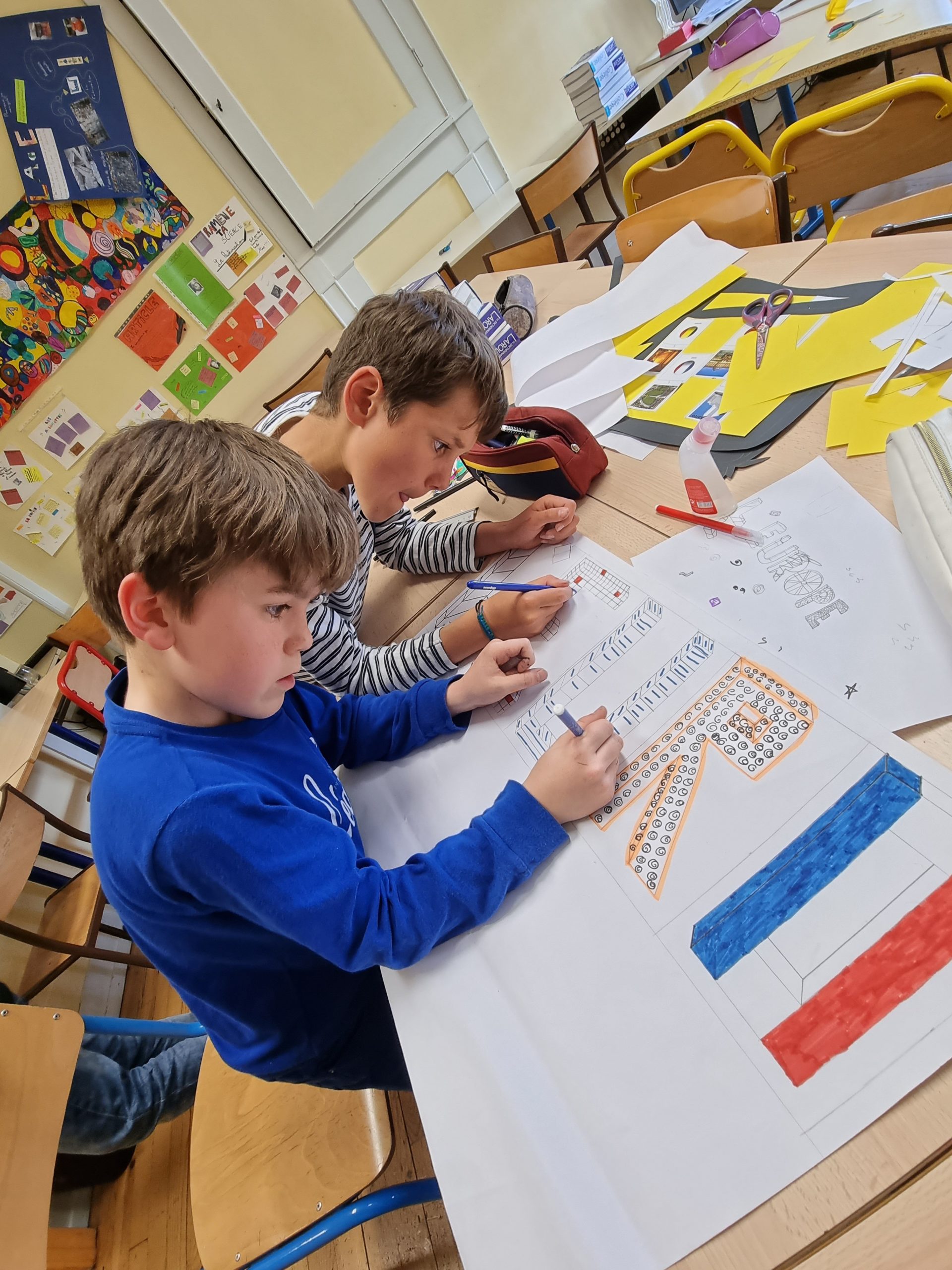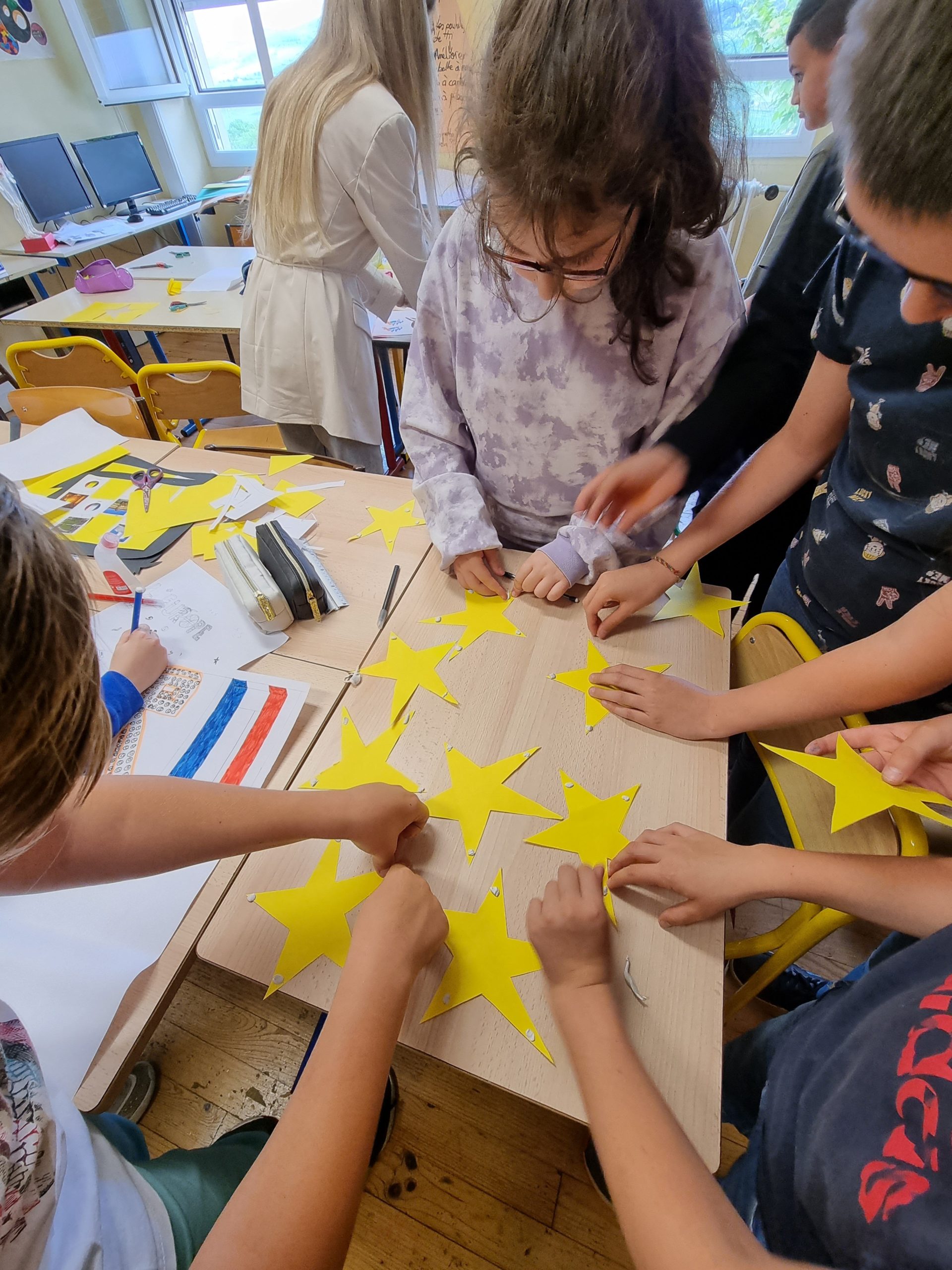 Nous avons travaillé sur les symboles de l’Europe : le drapeau avec son fond bleu qui représente un ciel sans nuage et ses 12 étoiles. Nous avons découvert que ces 12 étoiles ne représentent pas le nombre de pays. L’explication vient du nombre » douze » qui symbolise la perfection. Ces étoiles sont placées en cercle afin de marquer la solidarité et l’unité entre les pays.