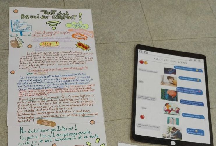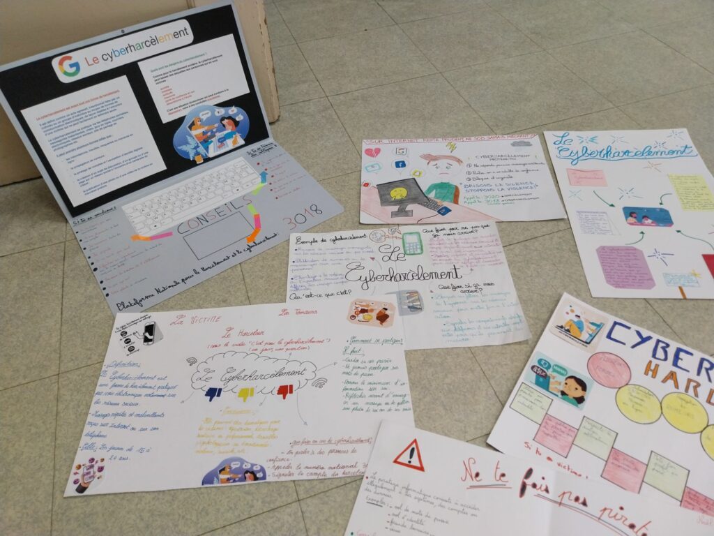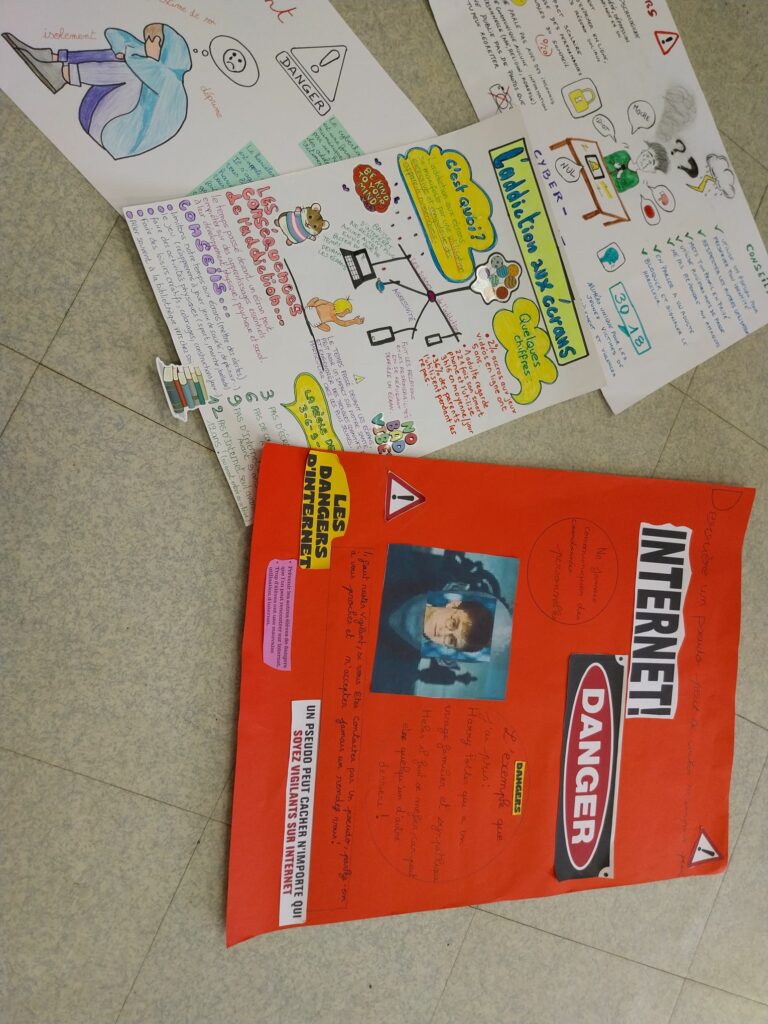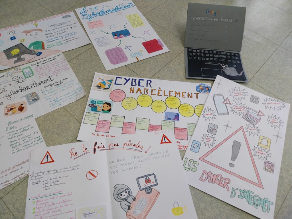 Ils devaient réaliser une affiche pour sensibiliser à divers dangers liés à l’utilisation d’internet : cyberharcèlement, piratage, fakenews, derrière un pseudo se cache n’importe qui, l’addiction aux écrans,…